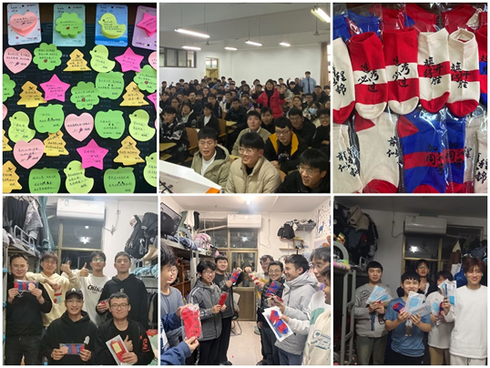 当晚,辅导员代表学院为考研学生赠送了印有“前程似锦”、“金榜题名”、“旗开得胜”等祝福语的状元袜及口罩,并书写了饱含祝愿和鼓励的便利贴送到学生手中——“一路无悔,一‘研’为定”、“放平心态,放手一搏”、“要努力,但不要着急,繁花似锦、硕果累累,都需要过程”、“窗外是风景,笔下有前途,低头是题海,抬头是未来”……一句句暖心的话语,一段段温馨的祝福,是教师对学生最真心的期望和鼓励。