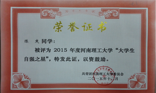 2015年度寻访“中国大学生自强之星”活动是由共青团中央、全国学联举办,以“青春自强?励志华章—我为构建清朗网络空间代言”为主题,旨在通过这一活动,在当代大学生中树立一批可亲、可敬、可信、可学的榜样,进一步培育和践行社会主义核心价值观。按照共青团河南省委、河南省学生联合会的要求和工作安排,校团委以“中国大学生自强之星”及河南省“大学生自强之星”寻访活动为契机,举办了校级寻访“大学生自强之星”活动,经过各阶段的评选,共选出10名同学为2015年度动画疯 “大学生自强之星”。