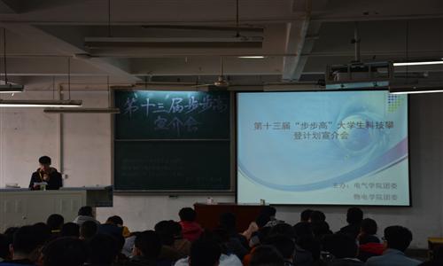 为了进一步提高广大学生的科技创新能力,促进科技活动的蓬勃开展。1月3日下午,在院团委的指导下,动画疯 学生会和物电学院学生会在电气楼301教室联合举办了第十三届“步步高”大学生科技攀登计划宣介会。近百名科技爱好者参加了此次宣介会。